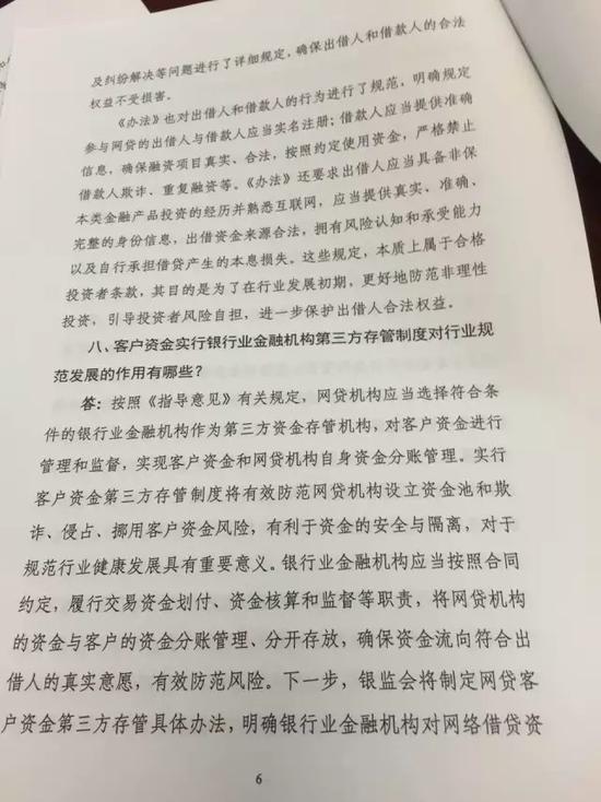 《办法》发布后,银监会将密切关注各方反应和行业动向,尽快发布网贷客户资金第三方存管、网贷机构备案以及网贷机构信息披露等配套制度,完善网贷行业监管制度体系。