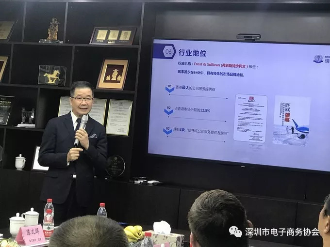 2018年8月24日,深圳市电子商务协会执行会长郝建强带领常务副会长企业和副会长企业前往瑞丰德永控股集团参加“国内企业走向世界的途径”主题沙龙,受到了瑞丰德永集团首席顾问麦总和董事长陈总的热情接待,参会的单位代表有盘古集团董事长陈文辉、尚美集团董事长石新安、通天地总经理施培泓、国泰建筑董事长滕锐、候鸟酒店董事长白波、英唐智控董事长钟勇斌、聚宝福董事长张保生等相关领导。